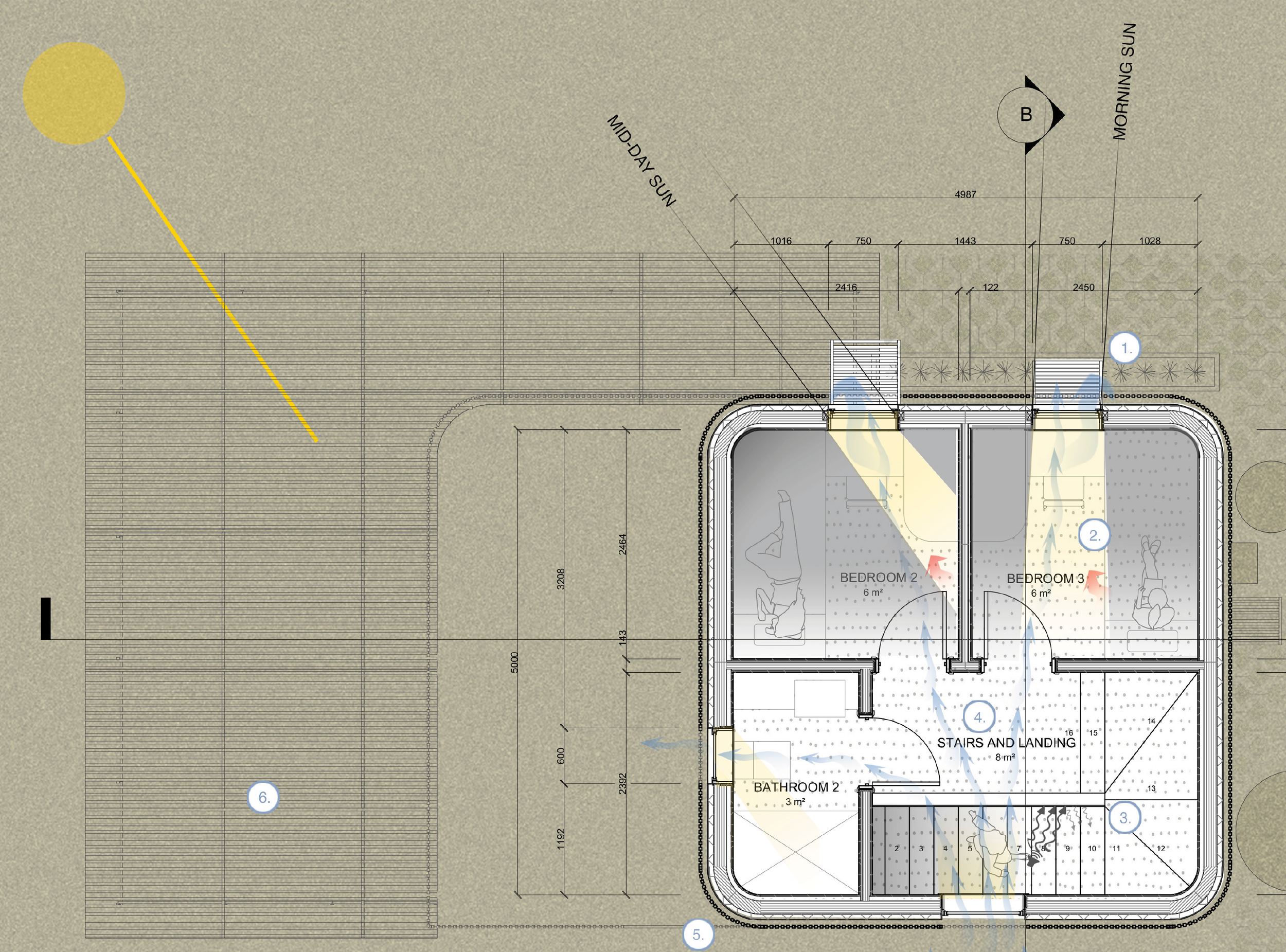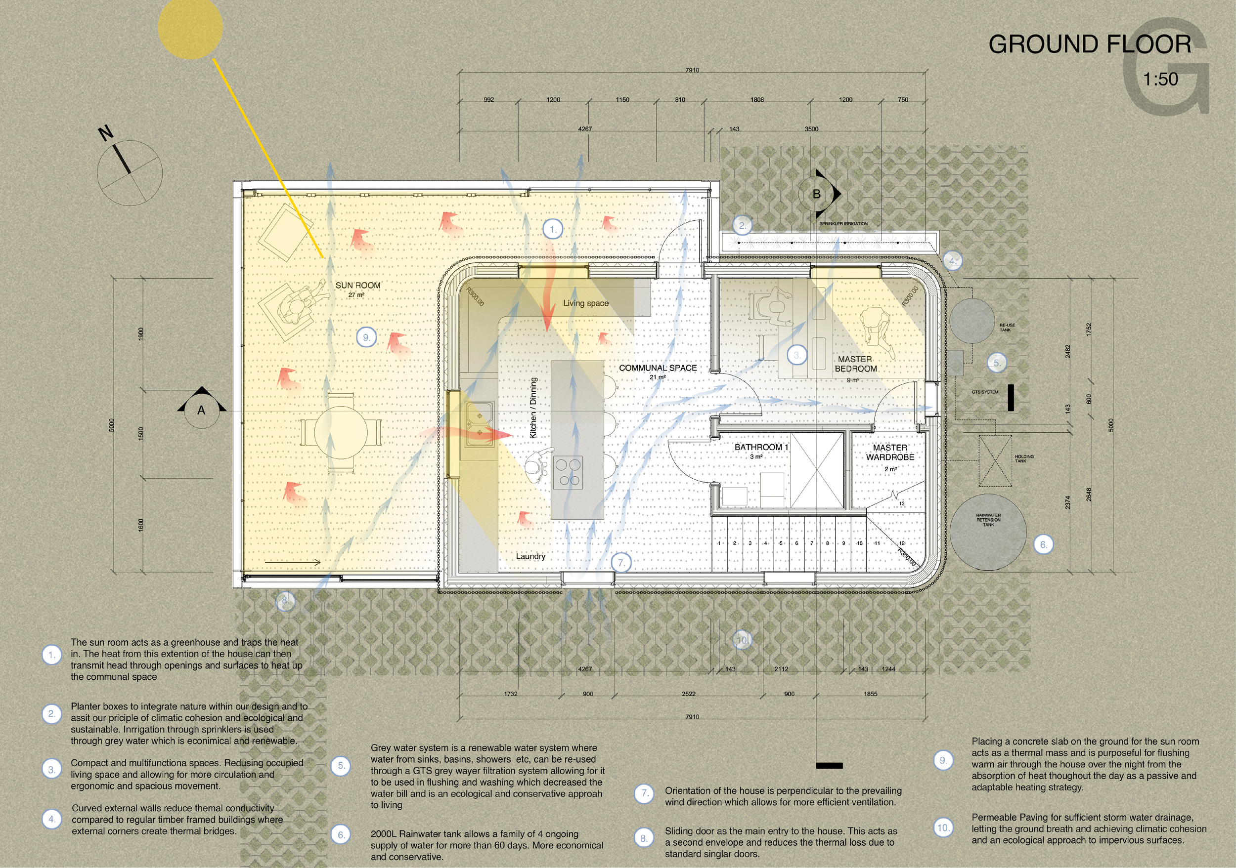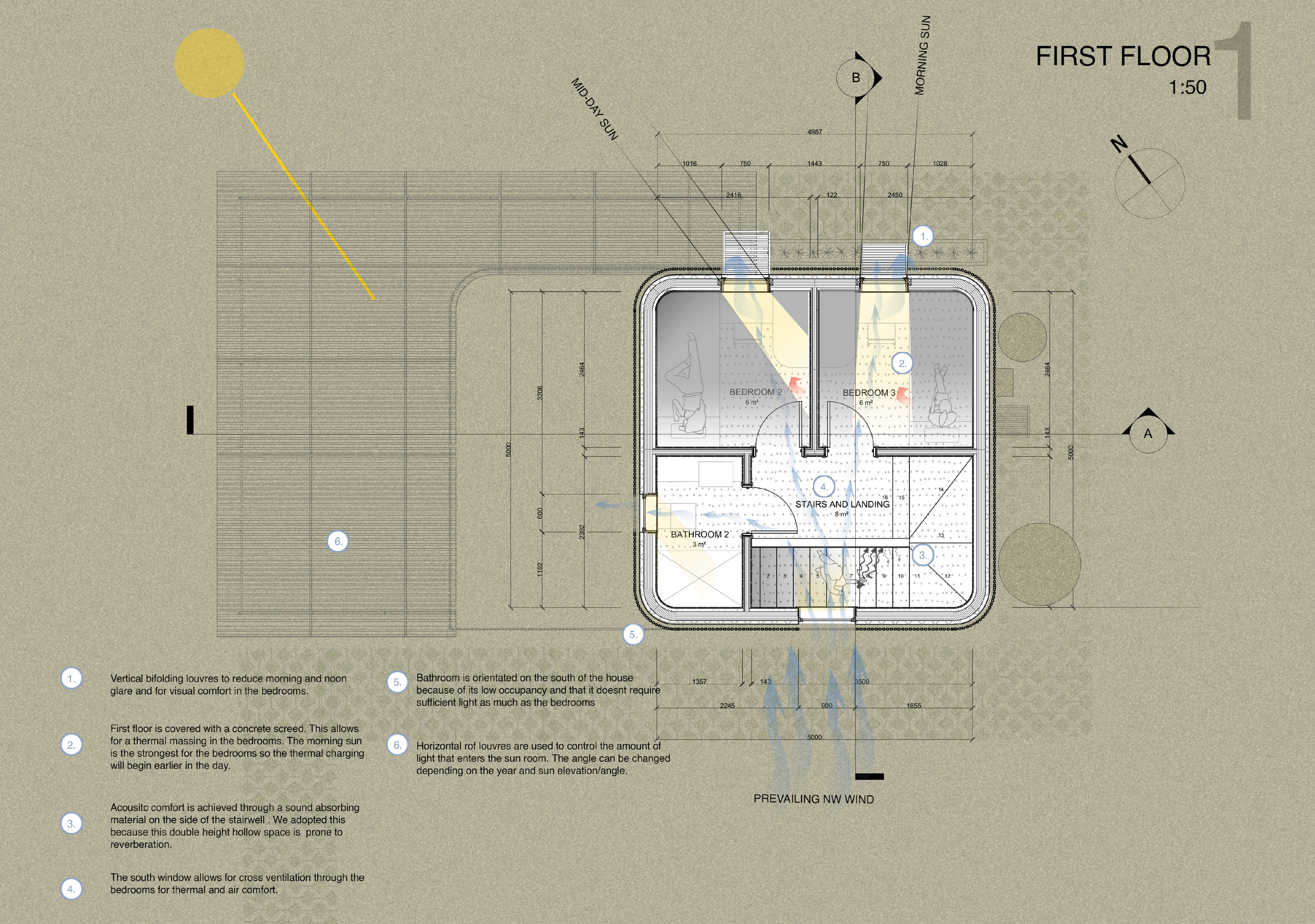 Architecture PostgraduateYear 2 // Semester 2Passive Housing Sustainability, Passive, Technology, HousingOur Project is a small urban devel opment based in Auckland. The design Process has been driven by THREE fundamental principles that underlie every decision made re garding the development process, such as site selection, building design, and material selection. These principles opt for a way of living built on energy efficiency and thermal comfort. The adaptive technologies are used to allow our clients to choose their best level of comfort. The client can create a comfort ing internal environment using adaptive and controlled strategies with the Like blinds-fusion vertical bi-folding louvre system. On the northern side of the building, they allow for sun control and become an eave when fully opened. On the eastern side of the building, the vertical slates allow for glare protection from the morning sun. Louvres are also used on the sunroom, roof, allowing clients to choose and control the principle within our building.